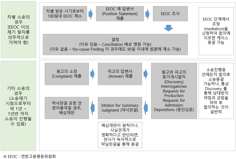 인사(HR) 소송은 크게 연방고용평가위원회(EEOC)의 조정 절차를 거치는 것과 이러한 절차 없이 바로 소송으로 진행되는 것으로 구분할 수 있다. 이 장에서는 소송의 절차에 대해 간략하게 요약하고자 한다.